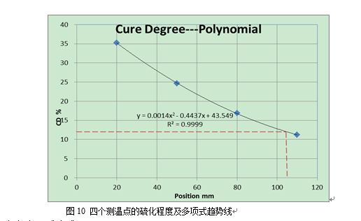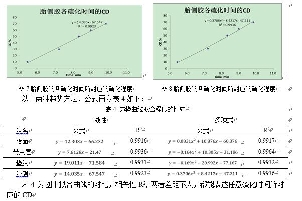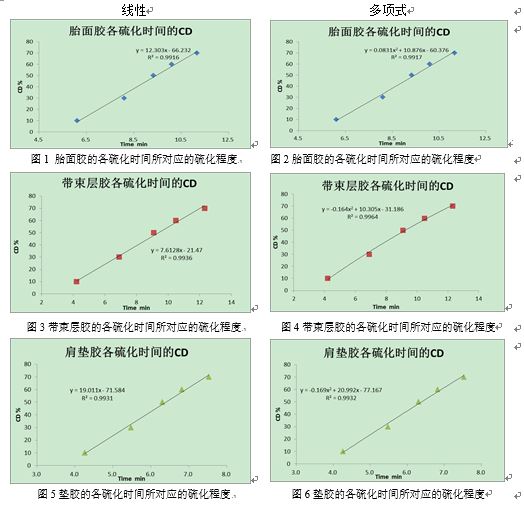 BPA橡膠試樣為楔形,在標(biāo)準(zhǔn)作業(yè)后,觀察到氣孔位置可計算出硫化時間(等效硫化時間),此外還需對已知硫化時間確定其在硫化過程中處于什么階段,即硫化程度(Cure Degree以下簡稱CD),這對膠料性能的分析很重要。行業(yè)內(nèi)一直沿用以正硫化時間為基準(zhǔn)的方法,隨著軟件對數(shù)理統(tǒng)計功能的發(fā)展,智能化程度較高的Excel數(shù)據(jù)表,可以對散點進(jìn)行趨勢線選擇,其中線性和多項式基本滿足要求(其中線性為一次函數(shù),多項式為二次函數(shù))。兩者相比較,與散點分布接近的是多項式曲線的擬合,因此用多項式曲線可以有效準(zhǔn)確的表征硫化程度的值。