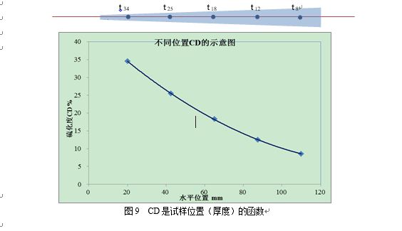 不同位置的CD值不同,隨著位置值(厚度)的增加,CD值下降,即CD是位置的函數(shù),且是個減函數(shù)。位置向右,CD值下降。硫化時間從t34降至t8 。