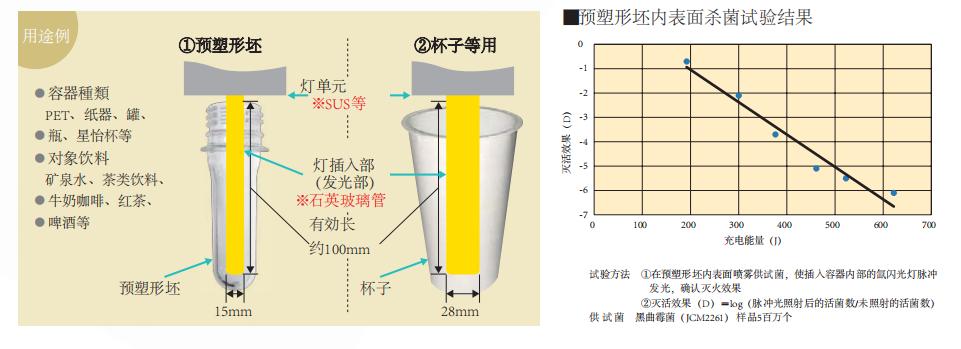 容器內(nèi)部直接插入氙閃光燈,使容器內(nèi)部發(fā)光,因此即使是深型容器也能均勻地向內(nèi)部放射紫外線。
